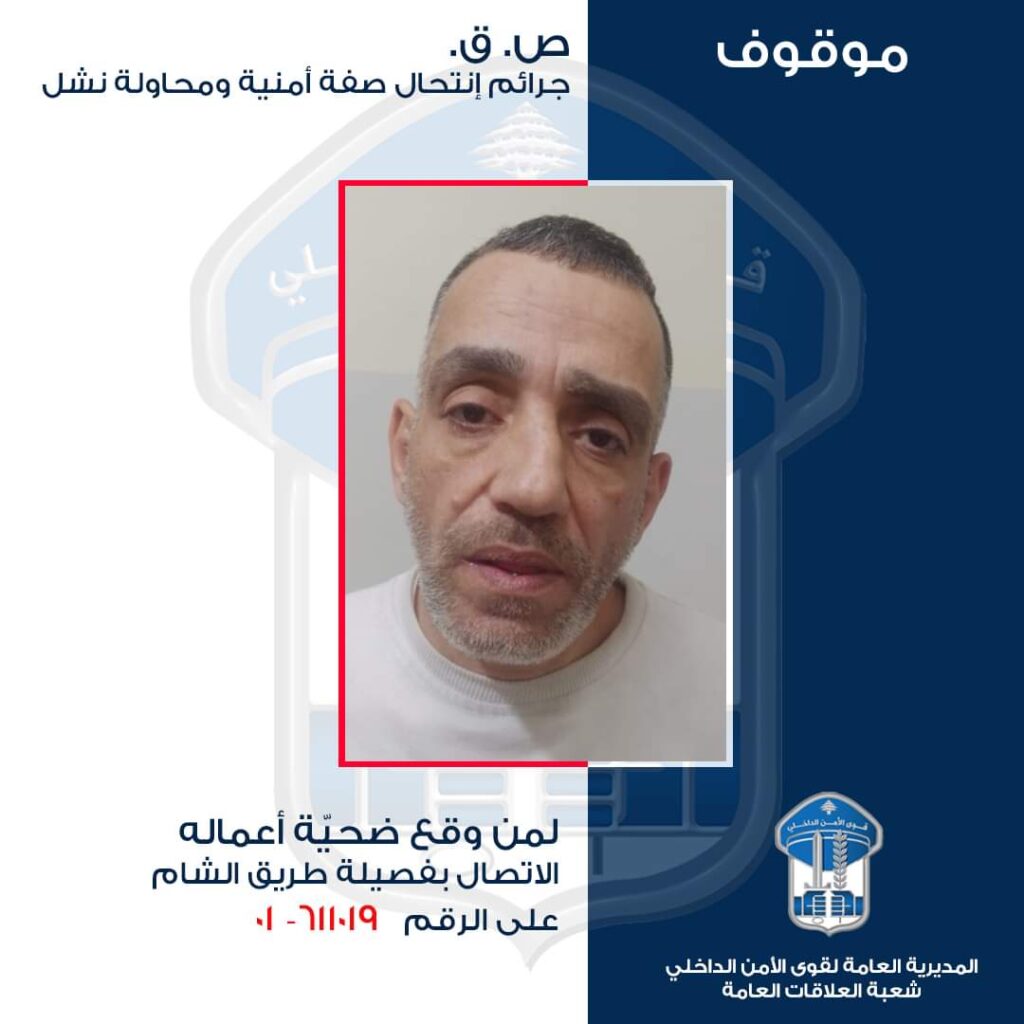 لذلك، تطلب هذه المديريّة العامّة من الذين وقعوا ضحيّة أعماله وتعرّفوا إليه، الحضور إلى فصيلة طريق الشّام في وحدة شرطة بيروت الكائنة في محلة السوديكو، أو الاتصال على الرقم: 611019-01، تمهيداً لاتخاذ الإجراءات القانونية اللازمة.