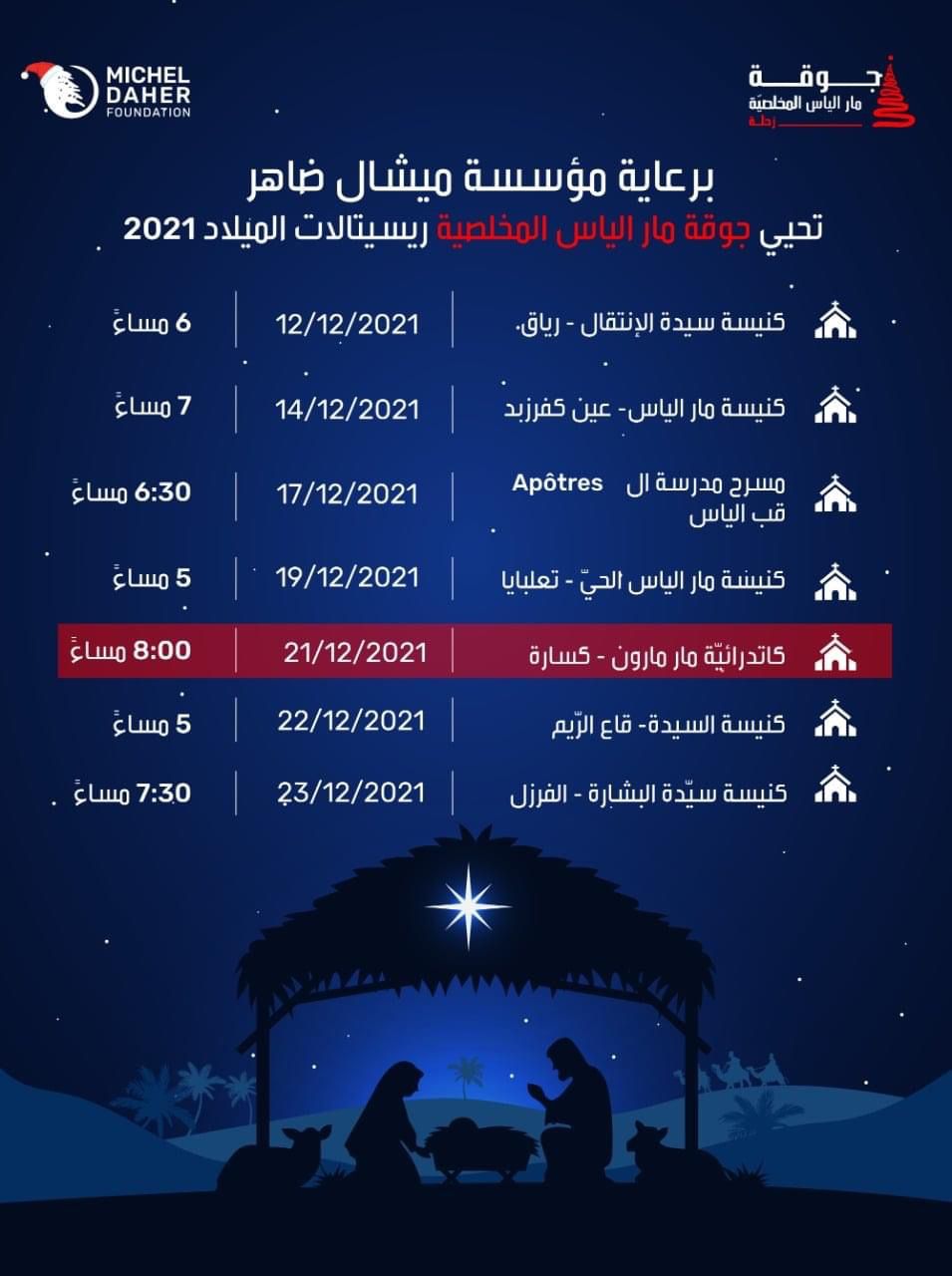 برعاية مؤسسة ميشال ضاهر تحيي جوقة مار الياس المخلصية سلسلة من الريسيتالات الميلادية لعام 2021 في مناطق عدة من البقاع الاوسط، إحياءً لزمن الميلاد المجيد في قلوب أبنائنا، في زمن مليء بصعوبات تلتفّ حول لبناننا…