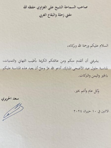 وحيث شكر سماحته هذه المشاعر تمنى دوام الصحة والعافية لدولة الرئيس على أن يعود العيد وهو بين أهله وناسه, وأن يكون لبنان مكتملا عقده مؤسسةً وشعباً.