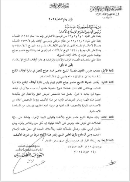 عيّن مفتي الجمهورية اللبنانية الشيخ عبد اللطيف دريان أمين سر دار الفتوى الشيخ عاصم الجراح رئيسًا لدائراة الأوقاف في منطقة البقاع، وذلك عبر قرار رسمي صدر عن المفتي وحمل الرقم ٨٧م/٢٠٢٤.