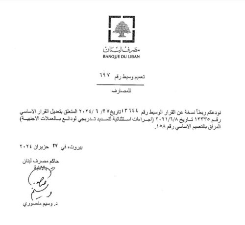 صدر عن مصرف لبنان بيان جاء فيه، “قرر المجلس المركزي لمصرف لبنان في جلسته المنعقدة في 2024/6/26 تجديد العمل بالتعميمين الأساسيين 158 و166 لمدة سنة واحدة قابلة للتجديد إعتباراً من 1 تموز 2024”.