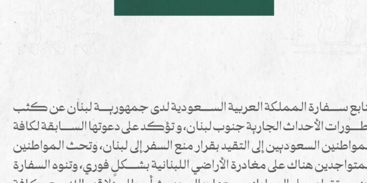 تتابع سفارة المملكة العربية السعودية لدى جمهورية لبنان عن كثب تطورات الأحداث الجارية جنوب لبنان، و تؤكد على دعوتها السابقة لكافة المواطنين السعوديين إلى التقيد بقرار منع السفر إلى لبنان.