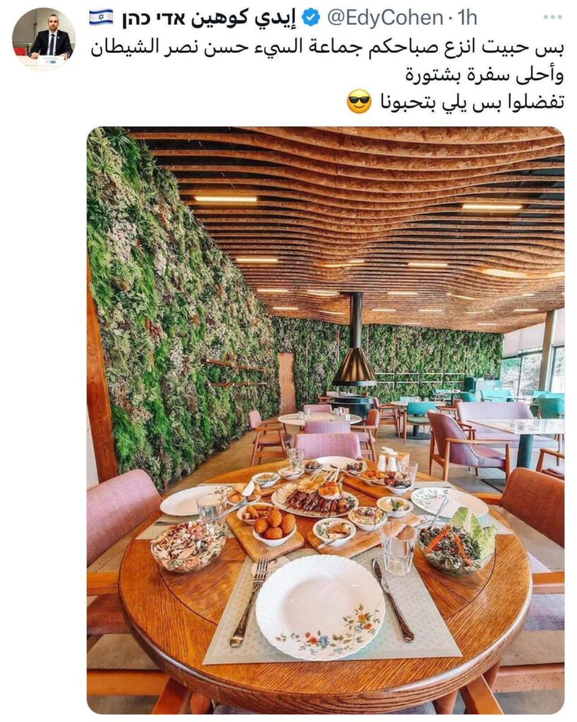 نشر الاسرائيلي المتطرف ايدي كوهين صورة لسفرة من مطعم لبناني، على حسابه x ، رفعها عن صفحة مطعم سما شتورا، ظناً منه ان بهذه السخافة يستطيع، ان يخيف اللبنانيين ويهددهم باسلوب غبي.