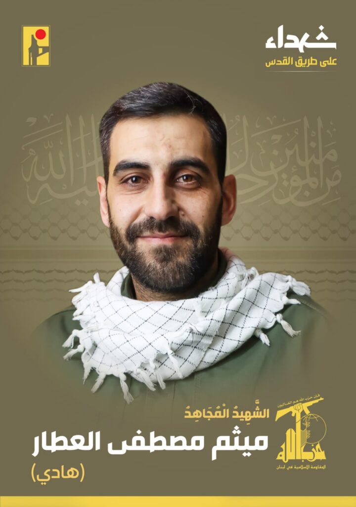 بمزيد من الفخر والإعتزاز، تزف المقاومة الإسلامية الشهيد المجاهد ميثم مصطفى العطار “هادي” مواليد عام 1991 من بلدة شعث في البقاع، والذي ارتقى شهيداً على طريق القدس.