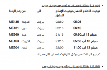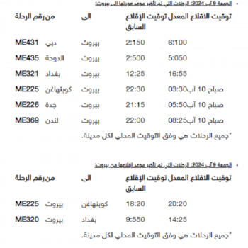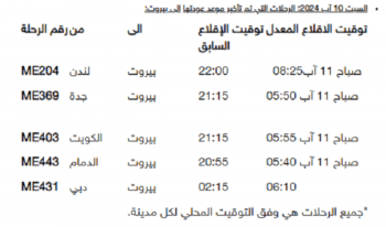 أما بالنسبة ليوم السبت 10 آب 2024، فالرحلات التي تم تأخير موعد عودتها الى بيروت: