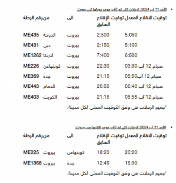 وبالنسبة ليوم الأحد 11 آب 2024، فالرحلات التي تم تأخير موعد عودتها الى بيروت واقلاعها من بيروت: