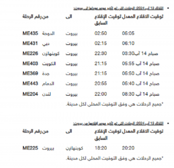 هذا، ويسمح للركاب المحجوزين حصراً على الرحلات المذكورة أعلاه بتغيير حجزهم مجاناً لمرة واحدة. لمزيد من المعلومات يرجى مراجعة: مركز الإتصالات MEA Call Center 961-01-629999 – [email protected] أو موقع الشركة الالكتروني www.mea.com.lb.