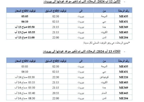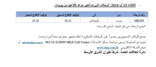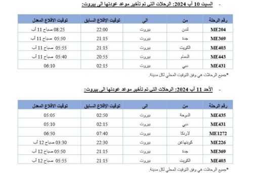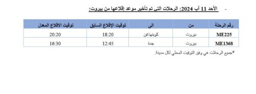 أعلنت شركة طيران الشرق الأوسط – الخطوط الجوية اللبنانية أن “رحلاتها للفترة الممتدة من 9 الى 13 آب 2024 ستبقى على مواعيدها باستثناء بعض الرحلات التي تم تعديلها, وذلك لأسباب تقنية تتعلق بتوزيع المخاطر التأمينية على الطائرات بين لبنان والخارج”.
