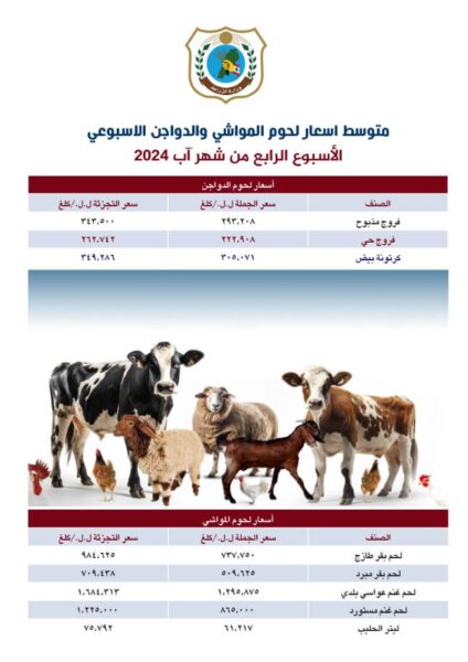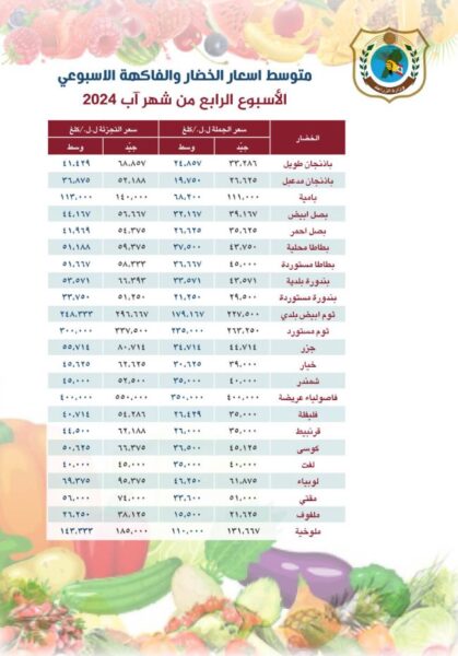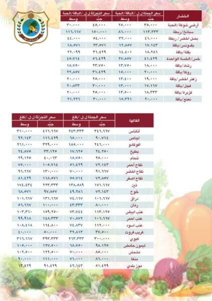 صدر عن وزارة الزراعة، اليوم الثلاثاء، بيان جاء فيه: “تتابع وزارة الزراعة حركة اسعار الجملة والتجزئة للحوم والخضار والفاكهة والحليب بشكل يومي لوضع متوسط للاسعار امام الرأي العام منعاً للتلاعب، ولانسياب السلع بشكل سلس في الاسواق، وتضع بين ايديكم متوسط الاسعار، على ان يصدر بشكل منتظم حالياً مرة في الأسبوع”.