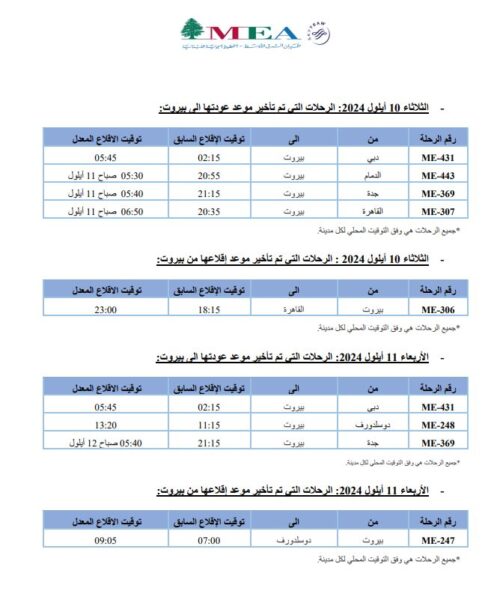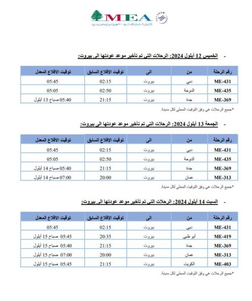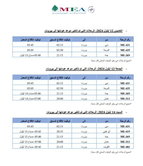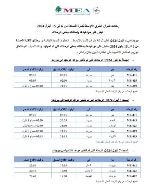 أعلنت شركة طيران الشرق الأوسط – الخطوط الجوية اللبنانية، اليوم الأربعاء، أن رحلاتها للفترة الممتدة من 6 الى 15 أيلول 2024 ستبقى على مواعيدها باستثناء بعض الرحلات التي تم تعديلها، وذلك لأسباب تقنية.