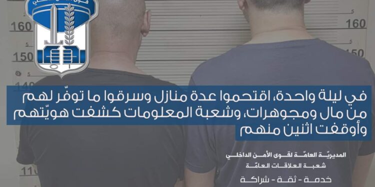 في إطار المتابعة اليوميّة التي تقوم بها قوى الأمن الداخلي للحدّ من عمليّات السّرقة في مختلف المناطق اللّبنانية، وتوقيف المتورّطين بها، وبعد أن تعرّض بتاريخ 18-08-2024 عدد من المنازل في زوق مصبح لعمليات سرقة من قبل أشخاص مجهولين، دخلوها بواسطة الكسر والخلع وسرقوا ما توفّر من مجوهرات ومبالغ ماليّة، بحيث قُدِّرَت قيمة المسروقات الإجماليّة بأكثر من نصف مليون دولار أميركي.