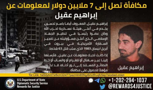 وعرض “برنامج مكافآت من أجل العدالة”، التابع لوزارة الخارجية الأميركية، معطيات شخصية تتعلق بإبراهيم عقيل، حيث ذكر البرنامج في بيان أنّ عقيل، المعروف أيضاً باسم “تحسين، وهو عضو في “مجلس الجهاد”، أعلى هيئة عسكرية في حزب الله.