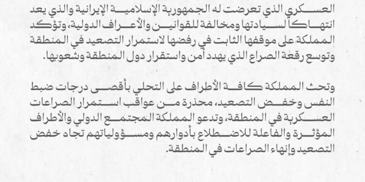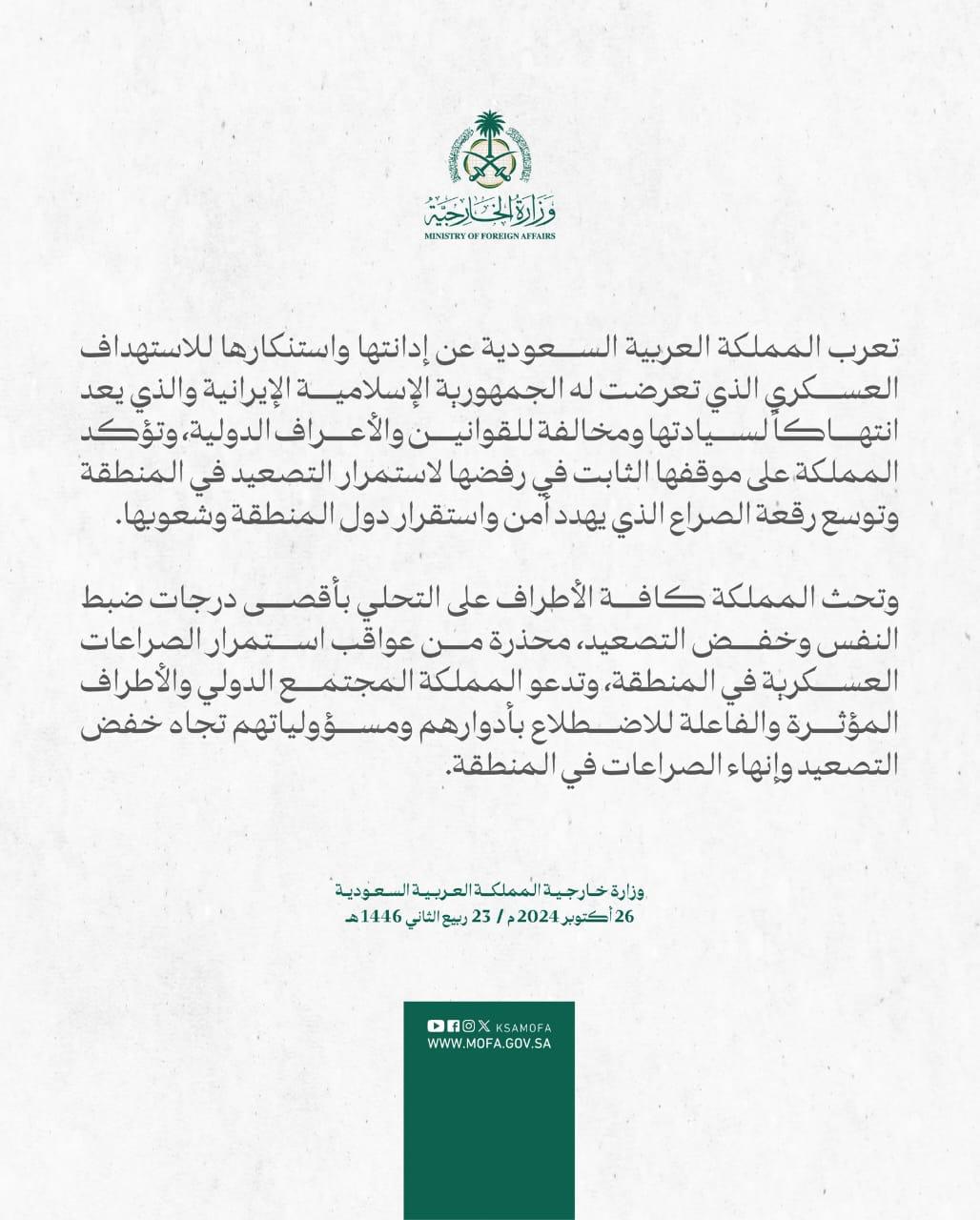 أعربت المملكة العربية السعودية عن إدانتها واستنكارها للاستهداف العسكري الذي تعرضت له الجمهورية الإسلامية الإيرانية والذي اعتبرته انتهاكاً لسيادتها ومخالفة للقوانين والأعراف الدولية، وأكدت المملكة على موقفها الثابت في رفضها لاستمرار التصعيد في المنطقة وتوسع رقعة الصراع الذي يهدد أمن واستقرار دول المنطقة وشعوبها.