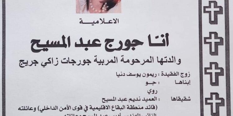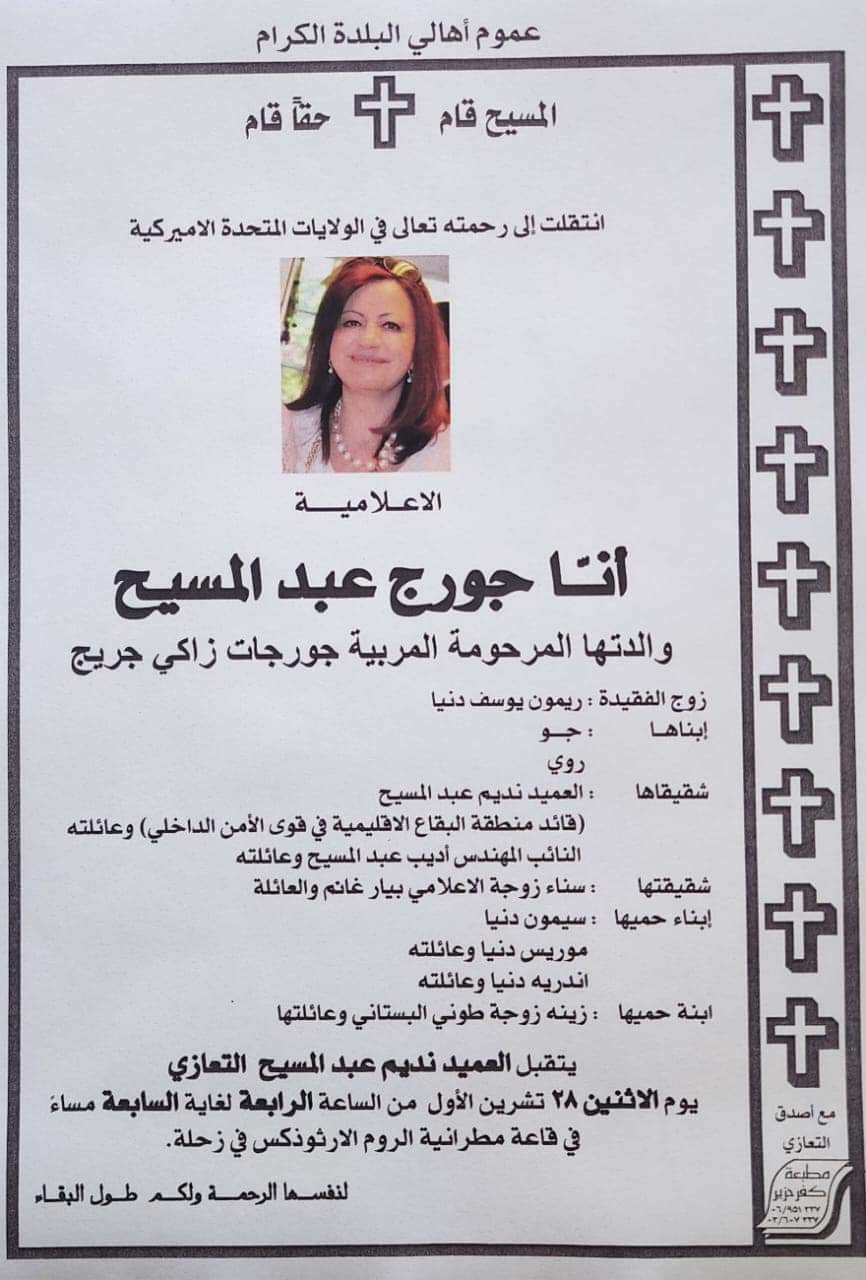 يتقبل العميد نديم عبد المسيح، قائد منطقة البقاع الإقليمية في قوى الأمن الداخلي، التعازي بوفاة شقيقته أنًا جورج عبد المسيح. ستقام مراسم التعزية اليوم الاثنين في قاعة مطرانية الروم الأرثوذكس في زحلة، وذلك بين الساعة الرابعة والسابعة مساءً.