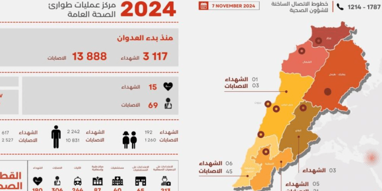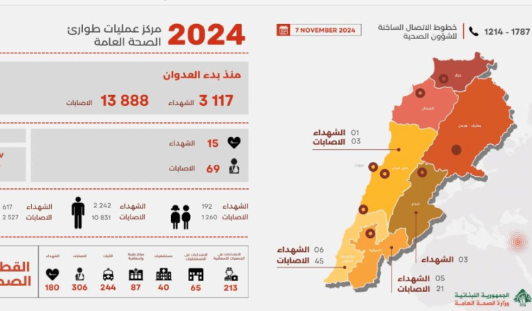 صدر عن مركز عمليات طوارئ الصحة العامة التابع لوزارة الصحة العامة التقرير اليومي لحصيلة وتداعيات العدوان الإسرائيلي على لبنان ، وفيه أن “غارات العدو الإسرائيلي ليوم أمس الخميس 7 تشرين الثاني 2024 اسفرت عن 15 شهيدا و 69 جريحا.