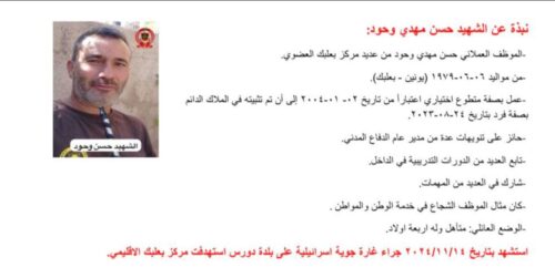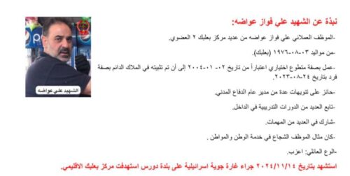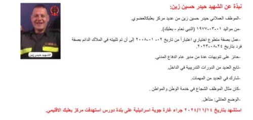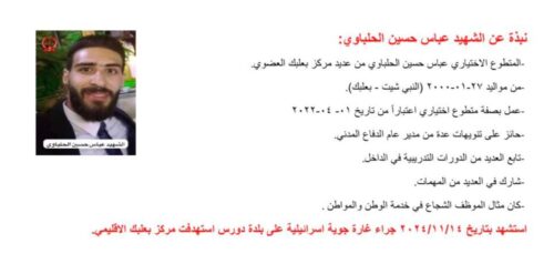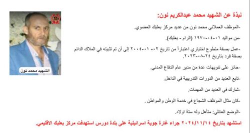 نعت المديرية العامة للدفاع المدني 12 شهيداً من الموظفين والمتطوعين من عديد مركز بعلبك الإقليمي الذين استشهدوا بتاريخ 14-11-2024 اثناء تأدية واجبهم الوطني والانساني، حيث استهدفت غارة جوية إسرائيلية مركز بعلبك الاقليمي في بلدة دورس.