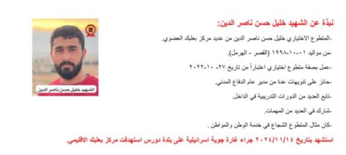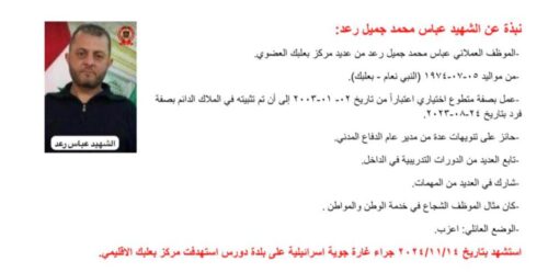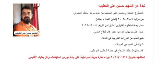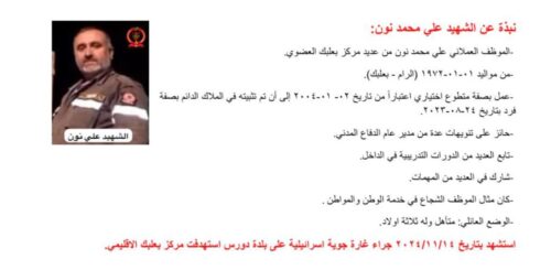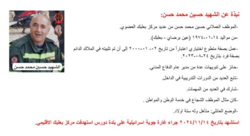 وفي بيان رسمي، كانت قد أكدت المديرية العامة للدفاع المدني أن فرق البحث والإنقاذ المتخصصة قد أنهت عند الساعة السابعة والنصف من مساء الخميس 14 تشرين الثاني عمليات رفع الأنقاض في موقع الغارة التي استهدفت المركز، مشيرة إلى أن الحصيلة النهائية للعملية أسفرت عن انتشال جثامين وأشلاء 14 شهيداً، بينهم 12 من عناصر المركز من موظفين ومتطوعين، بالإضافة إلى إصابة جريح واحد ما زال يخضع للعلاج في مستشفى بعلبك الإقليمي.