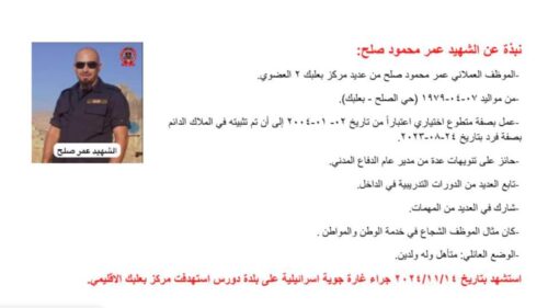 وكان مركز بعلبك الإقليمي، الواقع في بلدة دورس، قد تعرض مساء الخميس لعدوان جوي إسرائيلي أدى إلى تدمير كامل للمركز. وفي وقت الهجوم، كان عدد من موظفي الدفاع المدني والمتطوعين في المركز في حالة استعداد تام لتلقي نداءات الإغاثة وتقديم المساعدة العاجلة للمنكوبين في المنطقة.