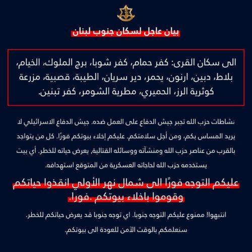 عاجل‬⁩ نجدد مناشدتنا العاجلة إلى سكان ⁧‫جنوب_لبنان‬⁩ في القرى التالية: