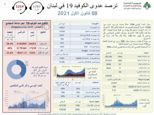 أعلنت وزارة الصحة العامة تسجيل 1994 إصابة جديدة بفيروس كورونا في لبنان.