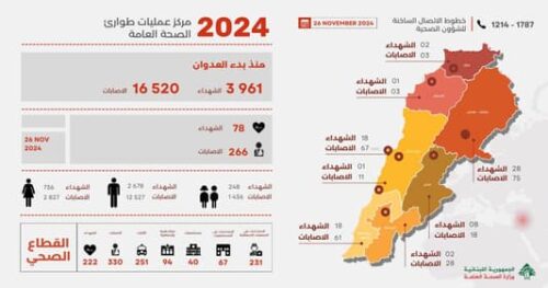 صدر عن مركز عمليات طوارئ الصحة العامة التابع لوزارة الصحة العامة التقرير المفصل بحصيلة تداعيات العدوان الإسرائيلي على لبنان، وفيه أن غارات العدو الإسرائيلي يوم الثلاثاء 26 تشرين الثاني 2024 أسفرت عن 78 شهيدا و266 جريحا.