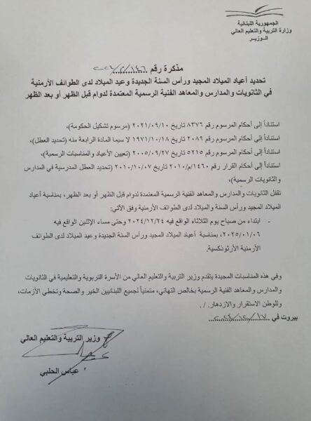 أصدرت وزارة التربية والتعليم العالي في لبنان بيانًا رسميًا، حددت فيه مواعيد العطلات المدرسية بمناسبة أعياد الميلاد المجيد ورأس السنة الميلادية، وأعياد الميلاد لدى الطوائف الأرمنية التي تتبع التقويم الأرثوذكسي.