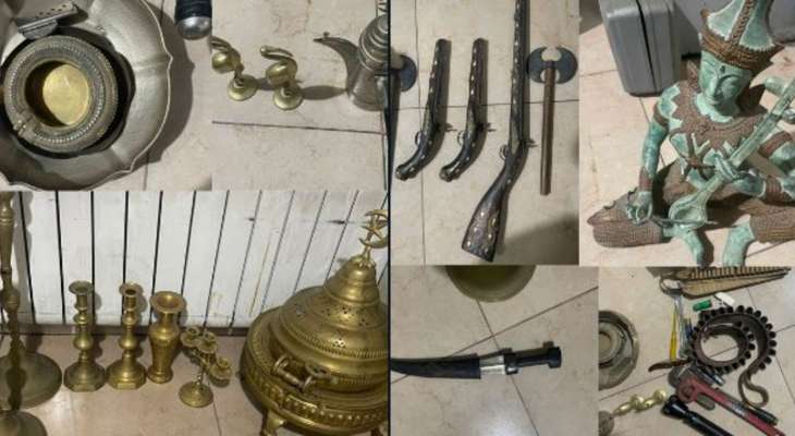 وأشارت في بلاغ، إلى أنّ “بالتّحقيق معه من قِبَل مخفر زحلة، اعترف بالسّرقة، وتمّ ضبط أغراض موجودة في سيّارته نوع “جيب شيروكي” لون أبيض صنع عام 2008، عبارة عن نحاسيّات وأدوات وأسلحة أثريّة”، لافتةً إلى أنّ “لذلك، وبناءً على إشارة القضاء المختص، تُعمِّم المديريّة العامّة لقوى الأمن الدّاخلي صور المضبوطات، وتطلب من أصحابها بحال التّعرف عليها، التّوجه إلى المخفر المذكور لاستلامها وفقًا للأطر القانونيّة”.