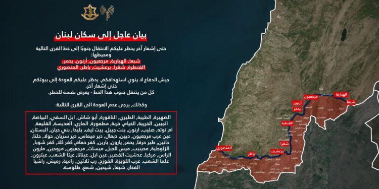 وشدّد في تصريح، على أنّه “يُحظر عليكم في هذه المرحلة العودة إلى بيوتكم من هذا الخطّ جنوبًا، حتّى إشعار آخر. كلّ من ينتقل جنوب هذا الخطّ يعرّض نفسه للخطر”. ودعا أيضًا إلى “عدم العودة إلى القرى التّالية: الضهيرة، الطيبة، الطيري، الناقورة، أبو شاش، إبل السقي، البياضة، الجبين، الخريبة، الخيام، خربة، مطمورة، الماري، العديسة، القليعة، ام توته، صليب، أرنون، بنت جبيل، بيت ليف، بليدا، بني حيان، البستان، عين عرب مرجعيون، دبين، دبعال، دير ميماس، دير سريان، حولا، حلتا، حانين، طير حرفا، يحمر، يارون، يارين، كفر حمام، كفركلا، كفرشوبا، الزلوطية، محيبيب، ميس الجبل، ميسات، مرجعيون، مروحين، مارون الراس، مركبا، عدشيت، القصير، عين إبل، عيناتا، عيتا الشعب، عيترون، علما الشعب، عرب اللويزة، القوزح، رب ثلاثين، رامية، رميش، راشيا الفخار، شبعا، شيحين، شمع؛ وطلوسة”.