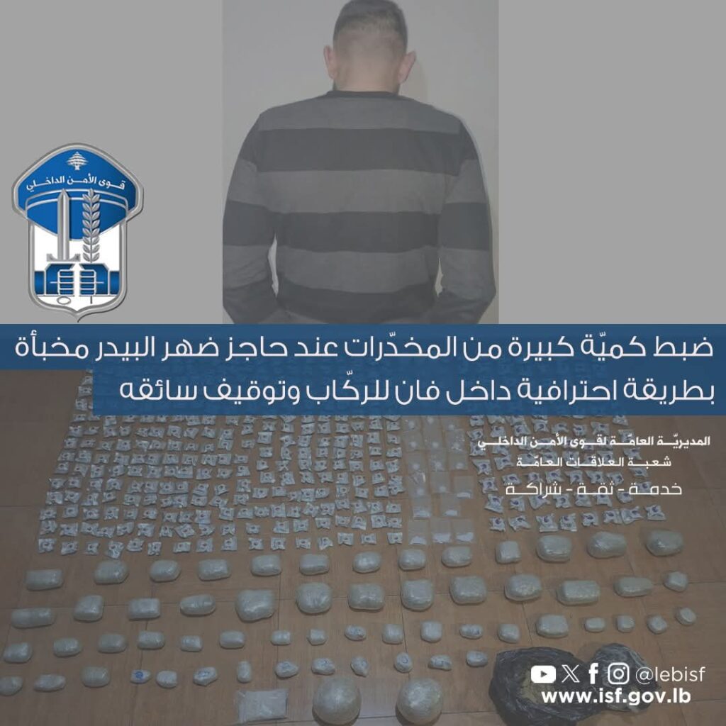 من خلال عمليّة تفتيش دقيقة، عُثر على كميّة متنوعة وكبيرة من المخدّرات موضّبة بطريقة احترافيّة في أماكن عدّة داخل الـ “فان”، وهي على الشّكل التّالي:
