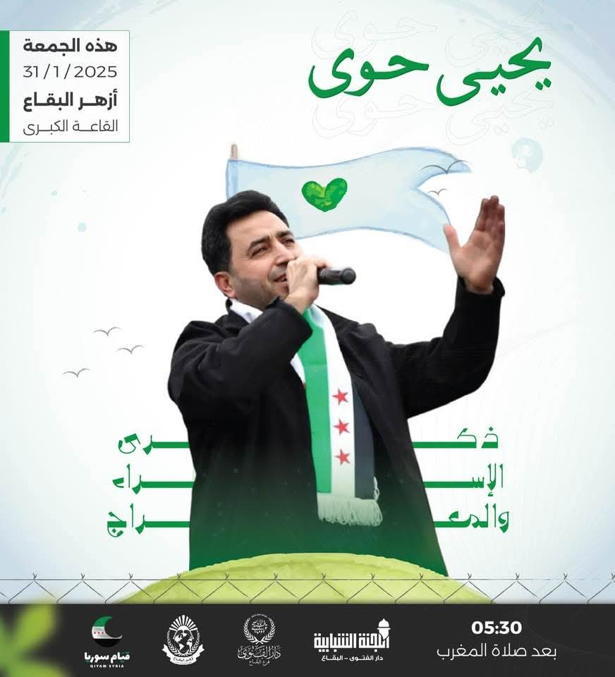 برعاية سماحة مفتي زحلة والبقاع الدكتور الشيخ علي الغزاوي تدعوكم اللجنة الشبابية في دار الفتوى البقاع بالتعاون مع فريق قيام سوريا لحضور الاحتفال بذكرى الإسراء والمعراج ووقوفاً مع فرحة أهلنا في سوريا وفلسطين.