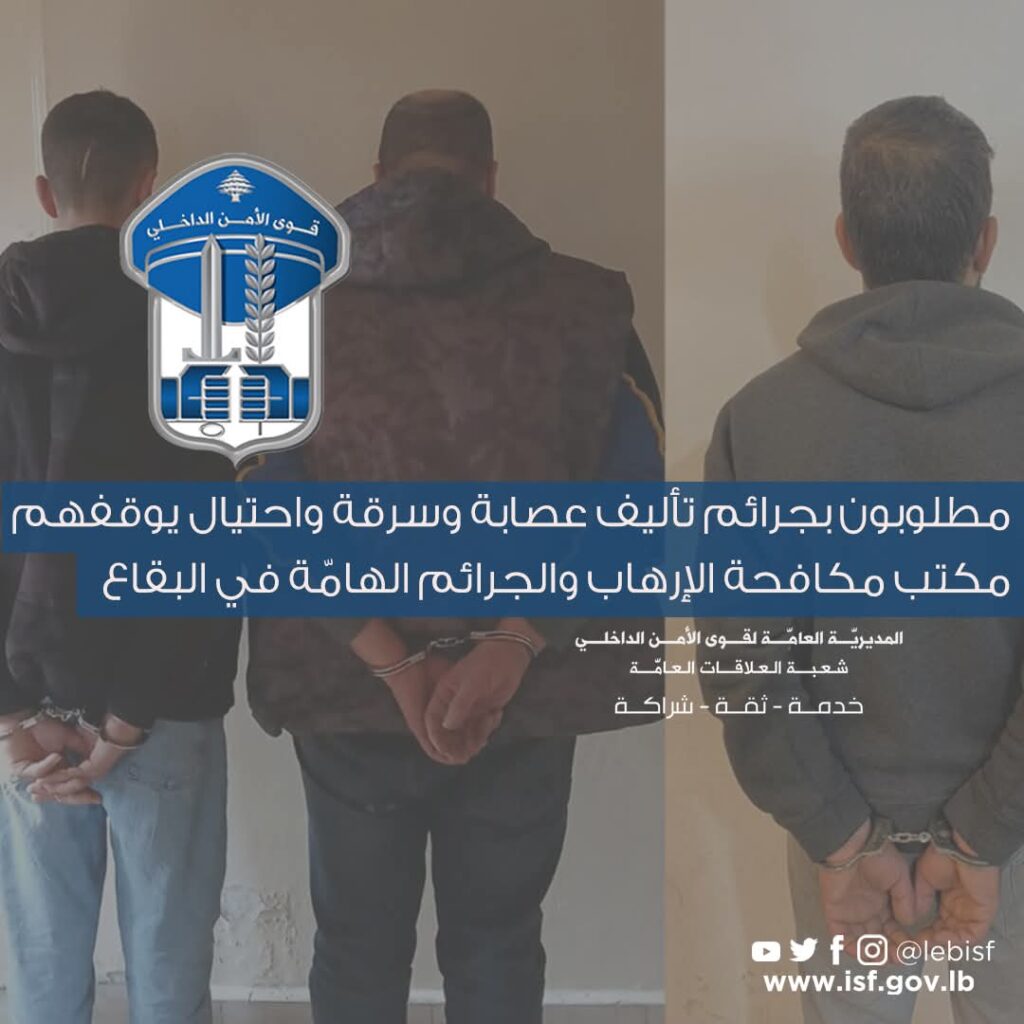 في إطار المتابعة اليوميّة التي تقوم بها قوى الأمن الدّاخلي لمكافحة الجرائم في مختلف المناطق اللّبنانية، وملاحقة المطلوبين للقضاء وتوقيفهم وتنفيذ المذكّرات العدليّة بحقّهم، وبعد عمليّات رصد وتعقّب، ونتيجةً لاستقصاءات وتحرّيات مكثّفة، تمكّنت قوّة من مكتب مكافحة الإرهاب والجرائم الهامّة في البقاع في وحدة الشّرطة القضائيّة، من توقيف: