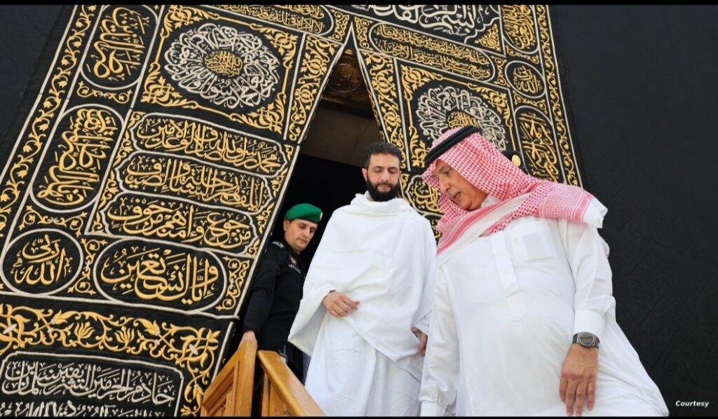 ونشر حساب الرئاسة السورية على إكس صورا ظهر الشرع وهو يخرج من الكعبة ويقبل الحجر الأسود ويؤدي الصلاة في الحرم المكي.