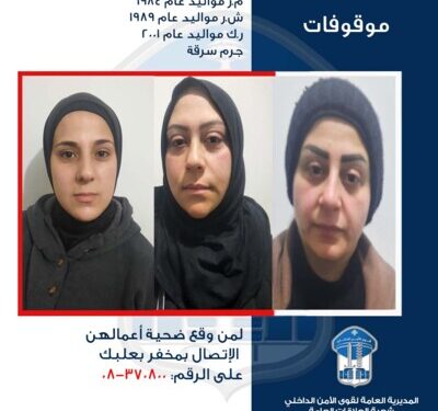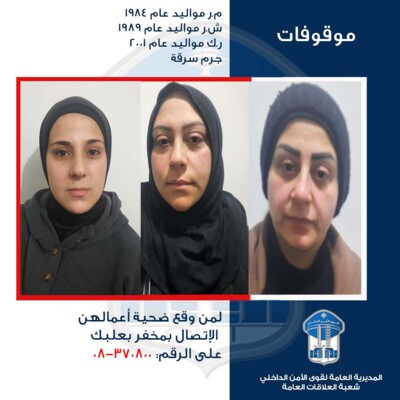 واضافت “باستماعهن، اعترفت (ش. ر.) بقيامهن بعملية السرقة. لذلك وبناء على إشارة القضاء المختص، تعمّم المديرية العامة لقوى الأمن الداخلي صور الموقوفات، وتطلب من الذين وقعوا ضحية أعمالهن وتعرفوا اليهن، الحضور الى مخفر بعلبك او الاتصال على رقم الهاتف ٣٧٠٨٠٠-٠٨، تمهيدا لاتخاذ الاجراءات القانونية اللازمة”.