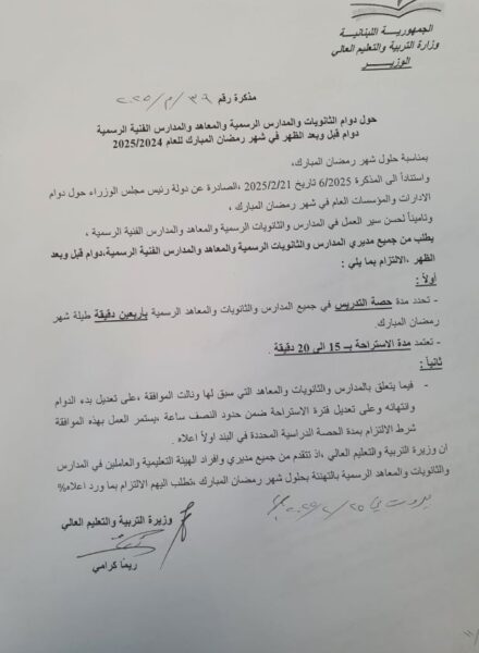 صدر عن وزارة التربية والتعليم، اليوم الثلاثاء، مذكرة، طالبت فيها وزيرة التربية والتعليم ريما كرامي من مديري المدارس والثانويات الرسمية والمعاهد والمدارس الفنية الرسمية دوام قبل الظهر وبعده، الالتزام ببنود معينة.