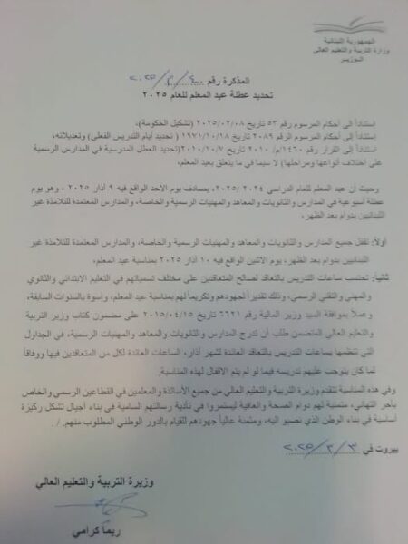 أصدرت وزيرة التربية، ريما كرامي، اليوم الاثنين، مذكرة رسمية تقضي بإقفال جميع المدارس والثانويات والمدارس المهنية في لبنان يوم الإثنين المقبل، 10 آذار 2025، بمناسبة عيد المعلم.