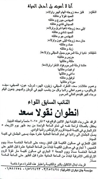 غيب الموت النائب السابق اللواء أنطوان نقولا سعد والذي شغل لسنوات عديدة مقعد الروم الأرثوذكس في قضاء راشيا والبقاع الغربي بعد استشهاد الرئيس رفيق الحريري وكان من الشخصيات البارزة في ثورة الأرز