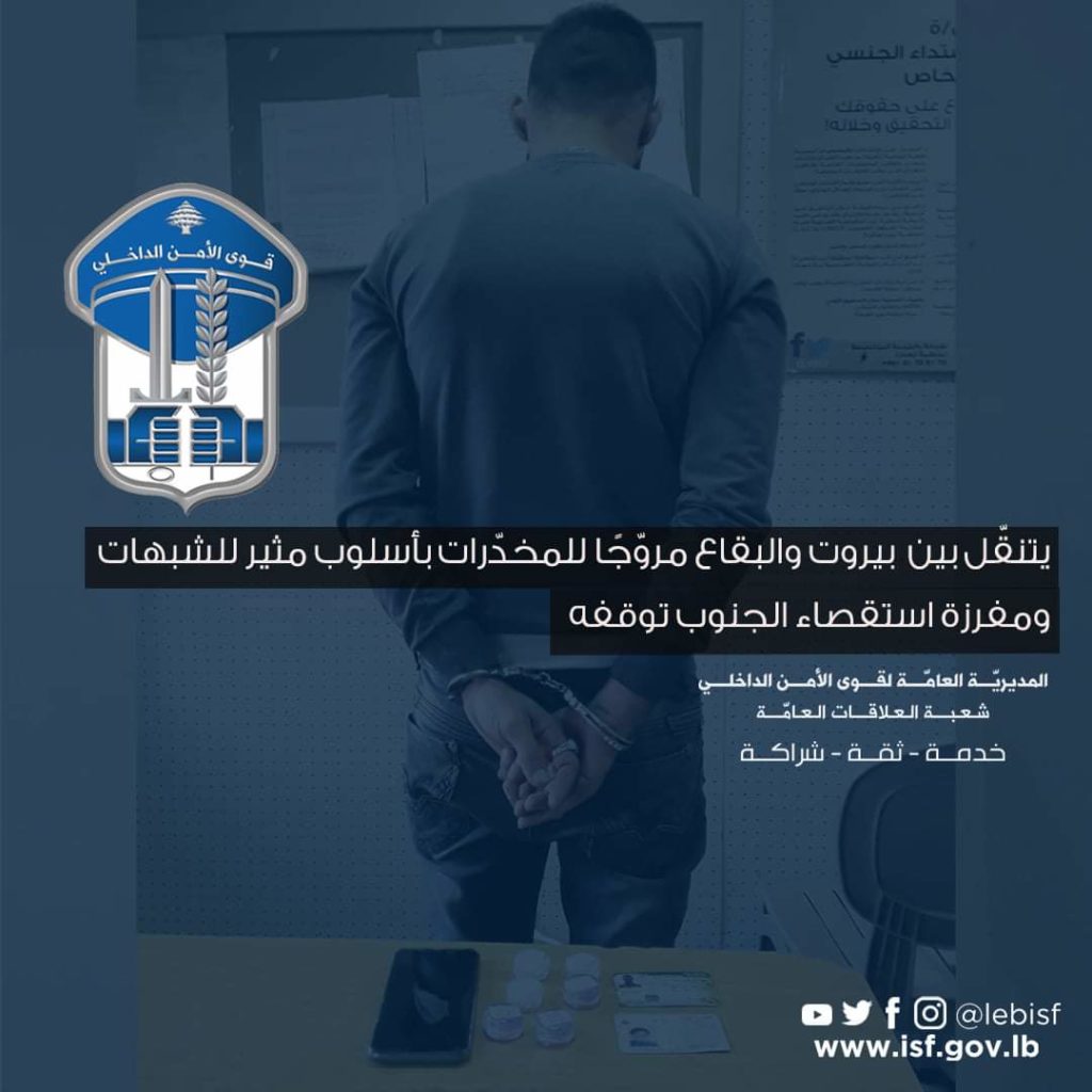 توافرت معلومات لدى مفرزة استقصاء الجنوب في وحدة الدّرك الإقليمي، حول تنقّل ع. ع. (من مواليد عام 1994، لبناني) ما بين محافظتي بيروت والبقاع وبحوزته موادّ مخدّرة مستخدمًا طريق النبطية – مرجعيون، بطرقة مثيرة للشُبُهات.