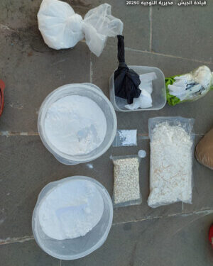 كذلك أعلنت القيادة، أن “دورية أخرى دهمت في منطقة المرح – الهرمل منازل مطلوبين وأوقفت المواطن (ع.ع.) والسوريين (ب.م.) و(م.ص.) و(ا.ص.) لإقدامهم على تصنيع المخدرات وترويجها لصالح أحد المطلوبين، وضبطت كمية كبيرة من حشيشة الكيف والكوكايين والمواد المخدرة، بالإضافة إلى أسلحة وذخائر حربية”.