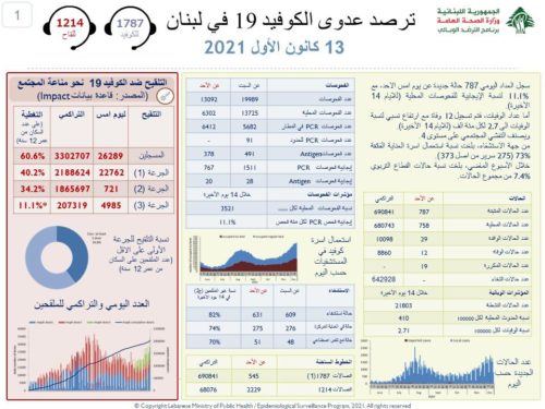أعلنت وزارة الصحة العامة تسجيل 787 اصابة جديدة بكورونا و12 حالة وفاة خلال الساعات الـ24 الماضية.