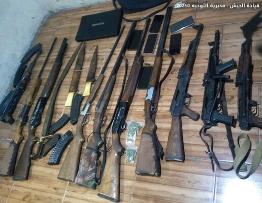 أعلنت قيادة الجيش، أنه “بتاريخ 13 /3 /2025، دهمت وحدة من الجيش تؤازرها دورية من مديرية المخابرات منازل مطلوبين في بلدة عرسال – بعلبك، وأوقفت المواطنَين (خ.ح) و(ا.ح) لاتجارهما بالأسلحة الحربية، وضبطت كمية منها. كما أوقفت المواطنين: (ع.ف)، (م.ف)، (ع.ح)، (خ.ر)، (ب.ح) لتعاطيهم المخدرات”.