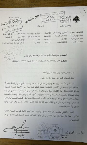 وجاء في نصّ الكتاب: “نودعكم ربطاً كتاب وزارة الدفاع الوطني المتعلّق بطلب عدم استخدام تطبيق تسوفار (Tzofar- Red- Alert) والذي يُستَخدم في الأراضي الفلسطينية المحتلّة كنظام تنبيه يعمل على الأجهزة الخليوية وشبكة الانترنت، حيث يقوم بتوفير إشعارات فويرية وسريعة وإخطار المستخدمين في حينه حول التهديدات والهجمات الصاروخية أو حالات الطوارئ، كما يُشكّل خطراً مباشراً على البيانات الشخصية والجغرافية للمستخدم، وذلك لقدرته على تتبّع الأفراد، رسم الخرائط للبنية التحتية، كشف مواقع ومراكز حيوية، وخرق الأجهزة والتجسّس والتنصّت”.