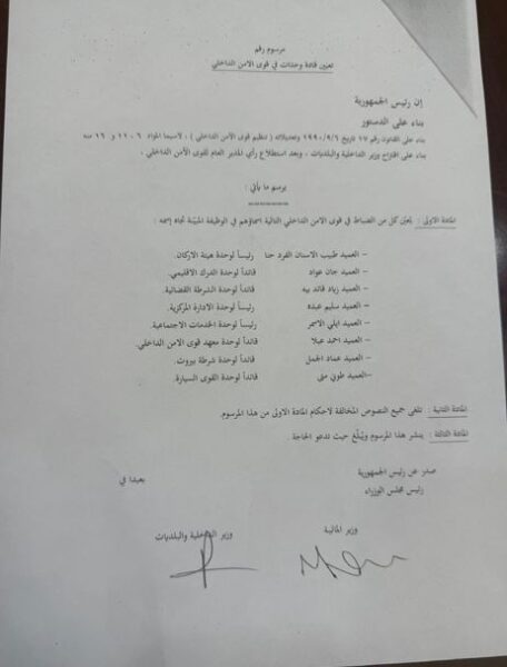 بناءً على اقتراح وزير الداخلية والبلديات أحمد الحجار, وبعد استطلاع رأي المدير العام لقوى الأمن الداخلي.