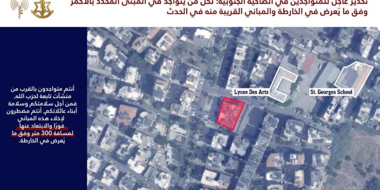 وكتب المتحدث باسم الجيش الإسرائيلي أفيخاي أدرعي على منصة “أكس”: “لكل من يتواجد في المبنى المحدد بالأحمر وفق ما يُعرض في الخارطة والمباني المجاورة له: أنتم تتواجدون بالقرب من منشآت تابعة لحزب الله من أجل سلامتكم وسلامة أبناء عائلاتكم أنتم مضطرون لإخلاء هذه المباني فوراً والابتعاد عنها المسافة لا تقل عن 300 متر وفق ما يُعرض في الخارطة”.