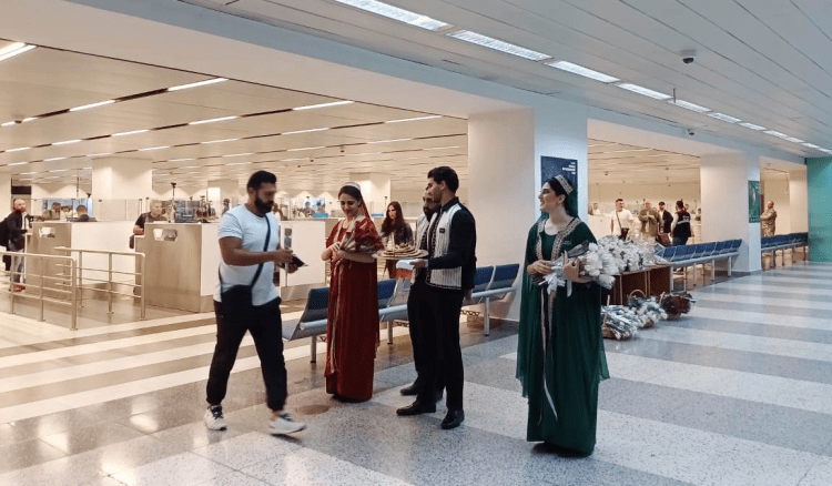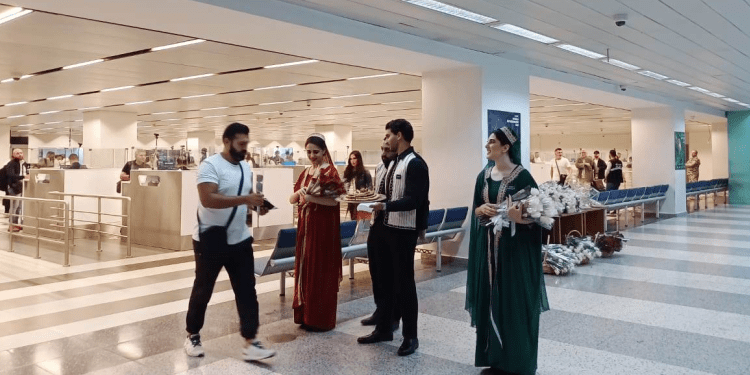 وازدانت صالة الوصول بالورود  لاستقبال الطائرة وركابها.