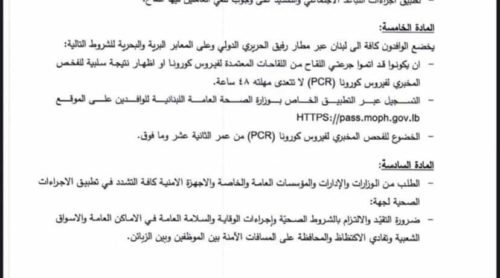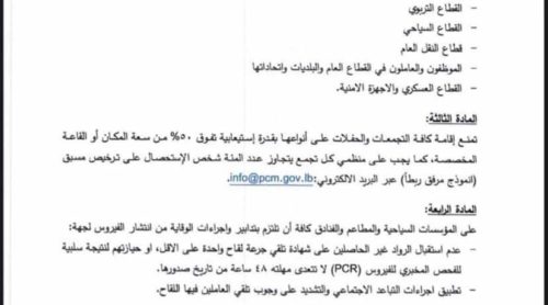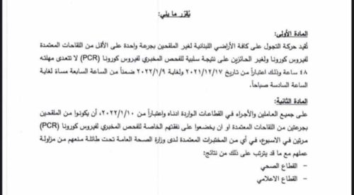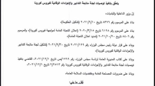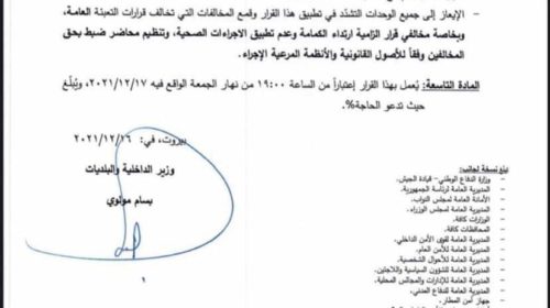 أصدرت وزارة الداخلية والبلديات تدابير جديدة، تتعلّق بتنفيذ توصيات لجنة متابعة التدابير والإجراءات الوقائية لفيروس “كورونا”، وذلك اعتبارًا من يوم غد الجمعة 17-12-2021. وفيما يلي نص التدابير كاملاً: