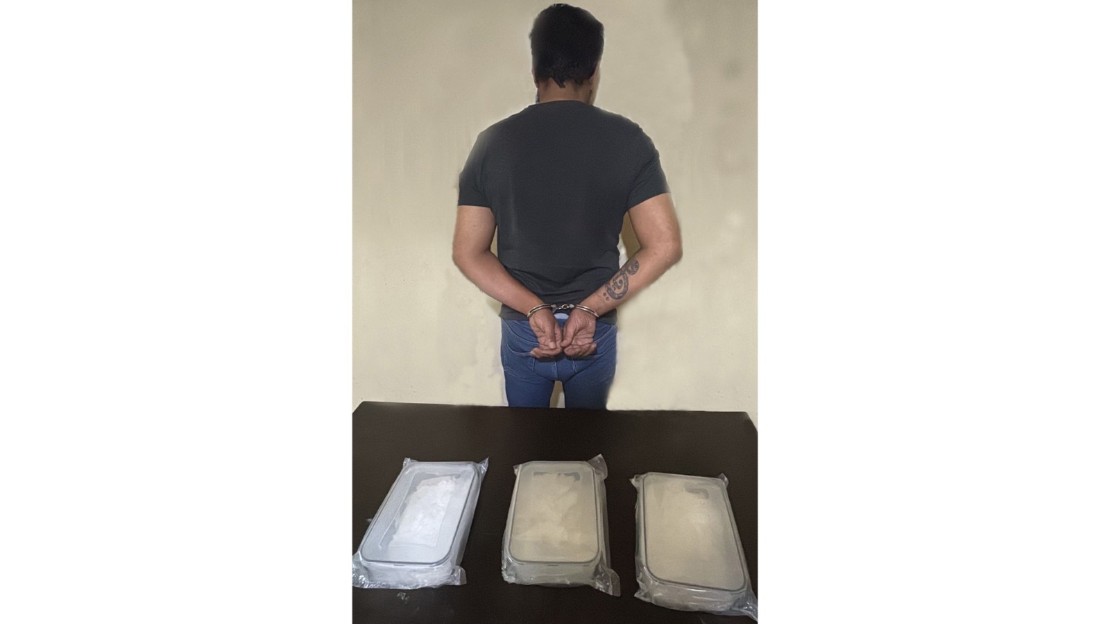 – ٣ علب بلاستيكية بداخلها حوالَي كيلو من مادّة الكوكايين (كل علبة حوالَي ٣٣٥ غرام).