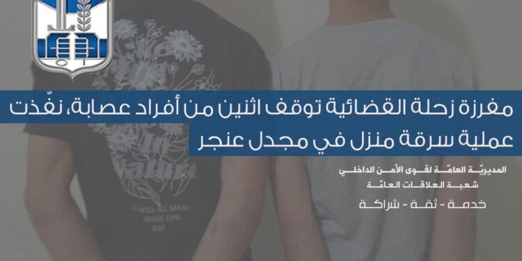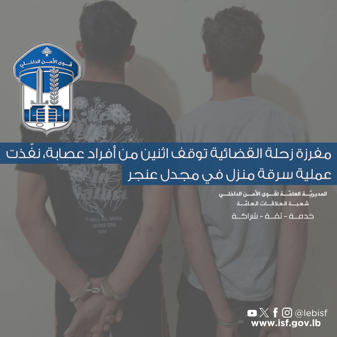 في إطار مكافحة الجرائم وملاحقة مرتكبيها وتوقيفهم على مختلف الأراضي اللّبنانيّة، وبعد تعرُّض أحد المنازل في بلدة مجدل عنجر البقاعيّة للسّرقة، من دون كسر أو خلع، والمسروقات كناية عن مبلغ مالي ومصاغ ذهبي ومسدّس حربي، وقُدِّرَت قيمتها بـ /25/ ألف دولار أميركي.