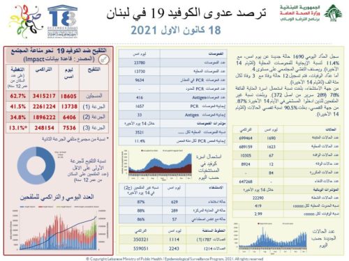 أعلنت وزارة الصحة العامة في تقريرها اليومي تسجيل “1690 إصابة جديدة بفيروس كورونا رفعت العدد التراكمي للحالات المثبتة الى 699464، كما تم تسجيل 12 حالة وفاة”.