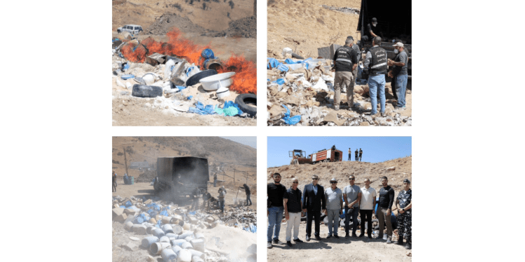 أعلنت المديرية العامة لقوى الامن الداخلي في بيان، أن “مكتب مكافحة المخدرات المركزي ومكتب مكافحة المخدرات الإقليمي – زحلة في وحدة الشرطة القضائية، وبناء على إشارة القضاء المختص، أتلفا كمية من المواد المخدرة المضبوطة، وذلك في مكب ضهر البيدر المستحدث، بحضور النائب العام الاستئنافي في البقاع القاضي منيف بركات، ورئيس قسم المباحث الجنائية العامة العميد جيرار نصر، ورئيس مكتب مكافحة المخدرات المركزي العقيد أيمن مشموشي، ورئيس مكتب مكافحة المخدرات الإقليمي في زحلة الرائد طوني القديس، ورئيس فرع الشكاوى والإرشاد والتوجيه والمراسم في شعبة العلاقات العامة النقيب محمد الحاج، والكاتب وليد عويدات من قلم النيابة العامة التمييزية، وبمؤازرة قوة من المجموعة الخاصة في وحدة الشرطة القضائية وقوة من شعبة المعلومات”.