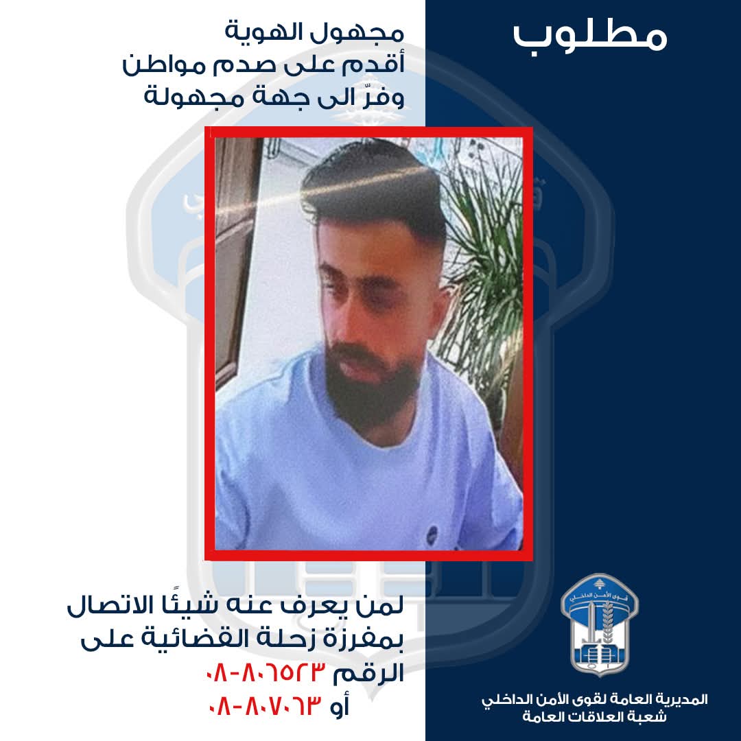 لذلك، وبناءً على إشارة القضاء المختص، تطلب المديرية العامة لقوى الأمن الداخلي ممن لديهم أي معلومات عن الحادث أو عن السيارة أو سائقها، الاتصال بـمفرزة زحلة القضائية في وحدة الشرطة القضائية على أحد الرقمين: 807063-08، 806523-08، للإدلاء بما لديهم من معلومات، علمًا بأن كل من يُساهم في تقديم أي معلومة يبقى اسمه طي الكتمان، وفقًا للقانون.